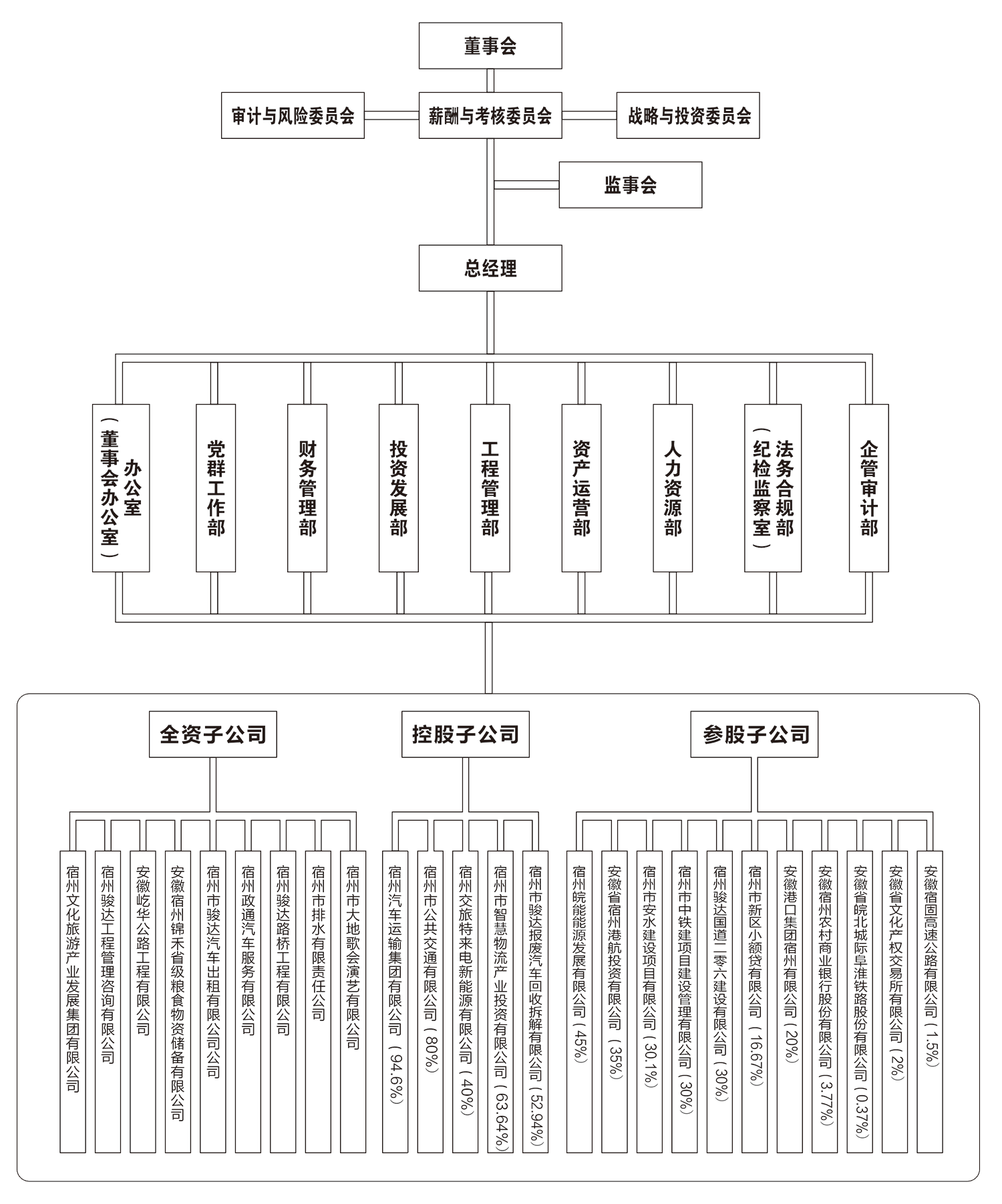 宿州交通文化旅游投資集團(tuán)有限公司是在原宿州交通投資集團(tuán)有限公司(2012年9月成立)基礎(chǔ)上組建而成,于2018年1月8日正式揭牌,是宿州市人民政府出資設(shè)立的國(guó)有獨(dú)資公司,具有一級(jí)法人資格,注冊(cè)資本金30億元,總資產(chǎn)138.18億元,是宿州市交通、文化、旅游產(chǎn)業(yè)發(fā)展的投融資平臺(tái)和國(guó)有資本運(yùn)營(yíng)公司,主要承擔(dān)全市交通、文化、旅游產(chǎn)業(yè)的投資、建設(shè)與運(yùn)營(yíng)管理任務(wù)。集團(tuán)機(jī)關(guān)內(nèi)設(shè)機(jī)構(gòu)9個(gè):辦公室(董事會(huì)辦公室)、黨群工作部、財(cái)務(wù)管理部、投資發(fā)展部、工程管理部、資產(chǎn)運(yùn)營(yíng)部、人力資源部、法務(wù)合規(guī)部(紀(jì)檢監(jiān)察室)、企管審計(jì)部;下屬全資子公司9個(gè),控股子公司5個(gè),參股子公司11個(gè)。